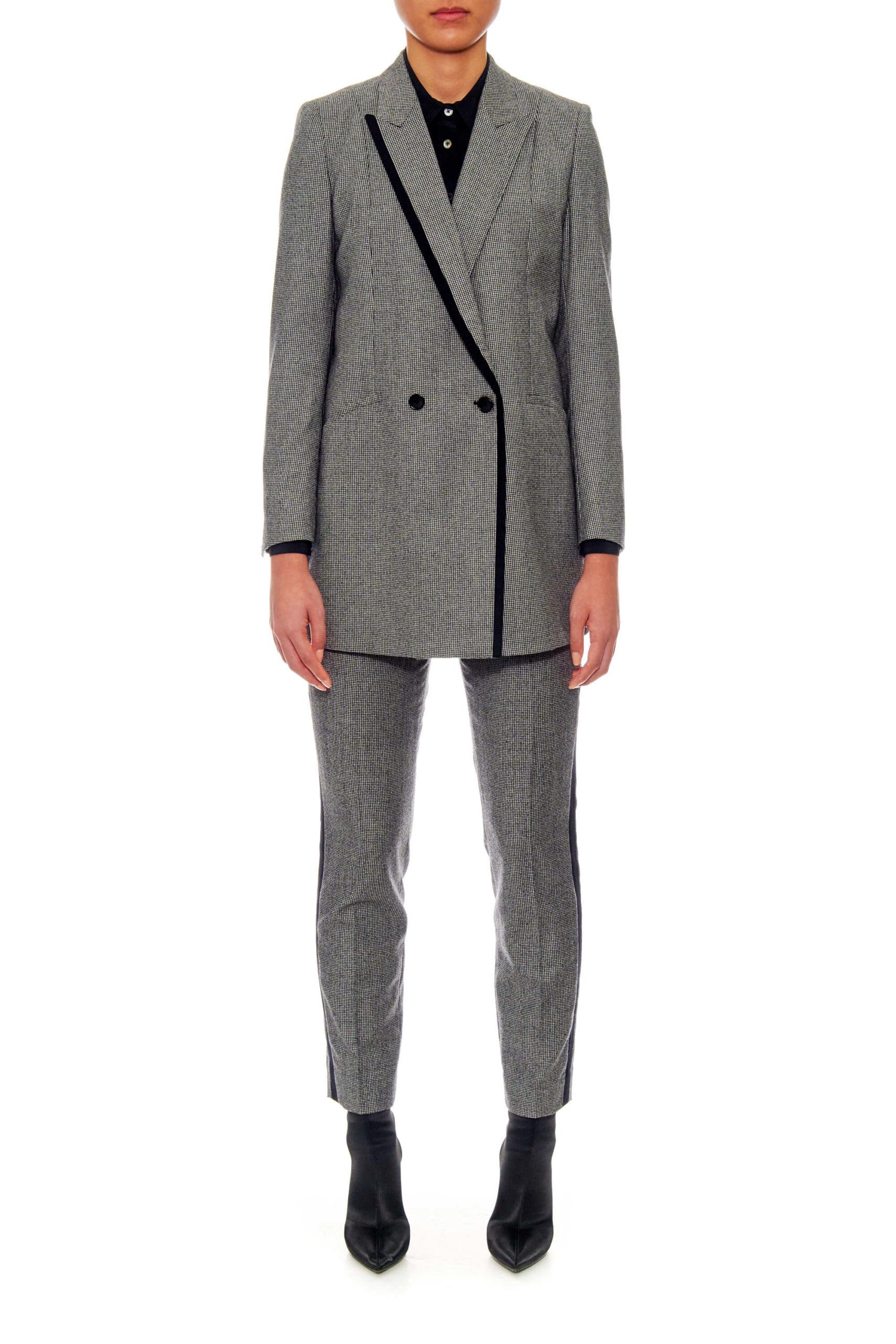 Long, relaxed fit two button, double breasted black and white houndstooth wool suit jacket with peaked lapels. Long, relaxed fit two button, double breasted wool suit jacket with peaked lapels and outlined centre front tape, matching the half moon rounded pocket. Working surgeon cuff button stand with contrast tape and full tonal satin lining. In black and white houndstooth Italian wool.