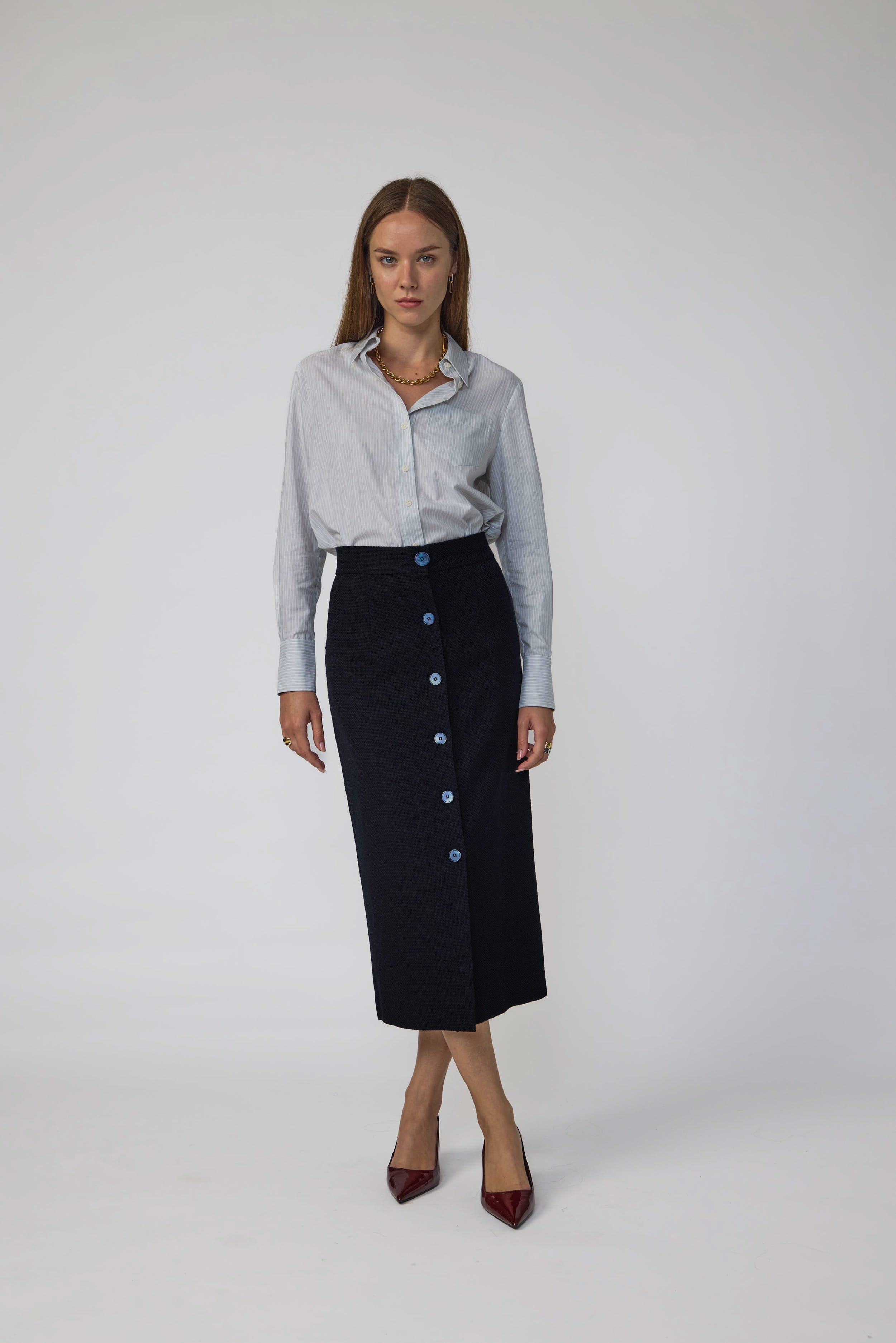 - Pencil skirt with front opening and classic side pockets, in navy basketweave wool