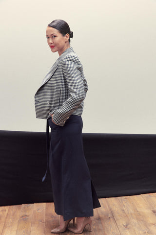 Short double breasted loose fit suit jacket made of pure navy blue wool in dogtooth Short double breasted half lined loose fit suit jacket made from pure navy blue wool in dogtooth with large peaked lapels and welt vertical welt pockets. Detailed with working surgeon cuffs, button stands and natural buttons.