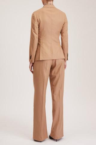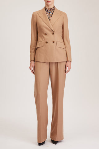 Double breasted, four button, slim fit suit jacket with peaked lapels in beige pure wool Double breasted, four button, slim fit suit jacket with peaked lapels and welt pockets in pure lightweight beige wool. Detailed with working surgeon cuff button stand and double vent.